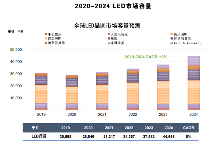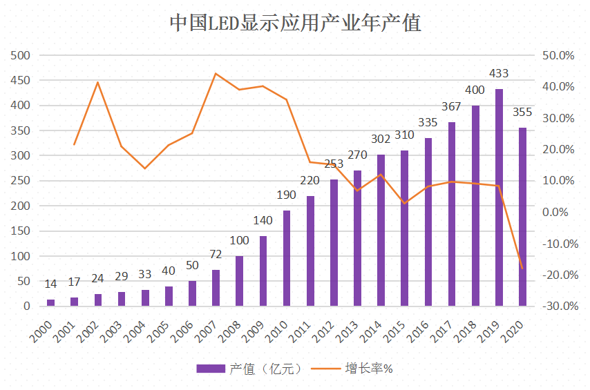 相关机构数据显示,2020年全球LED市值总额约为151.27亿美元(约合987.49亿元人民币),同比下降约10.2%;LED晶圆市场容量约为2884.6万片,同比下降约5.7%。其中我国LED显示应用产业全年产值预计下降约18%,达355亿元。